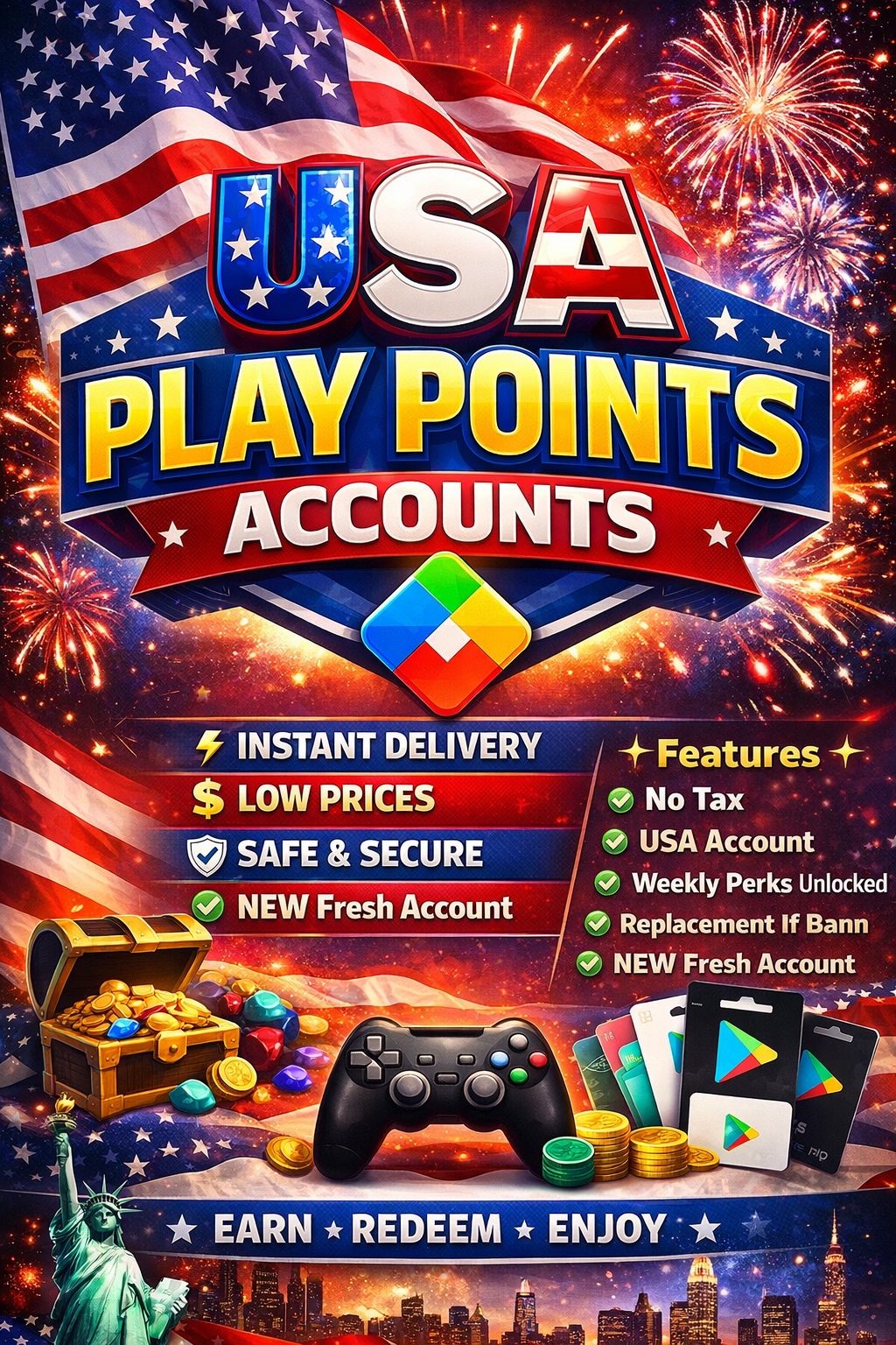 Get a premium USA Play Points Account with No Tax benefits and better rewards on every purchase. Enjoy weekly perks unlocked for extra bonuses and offers.
